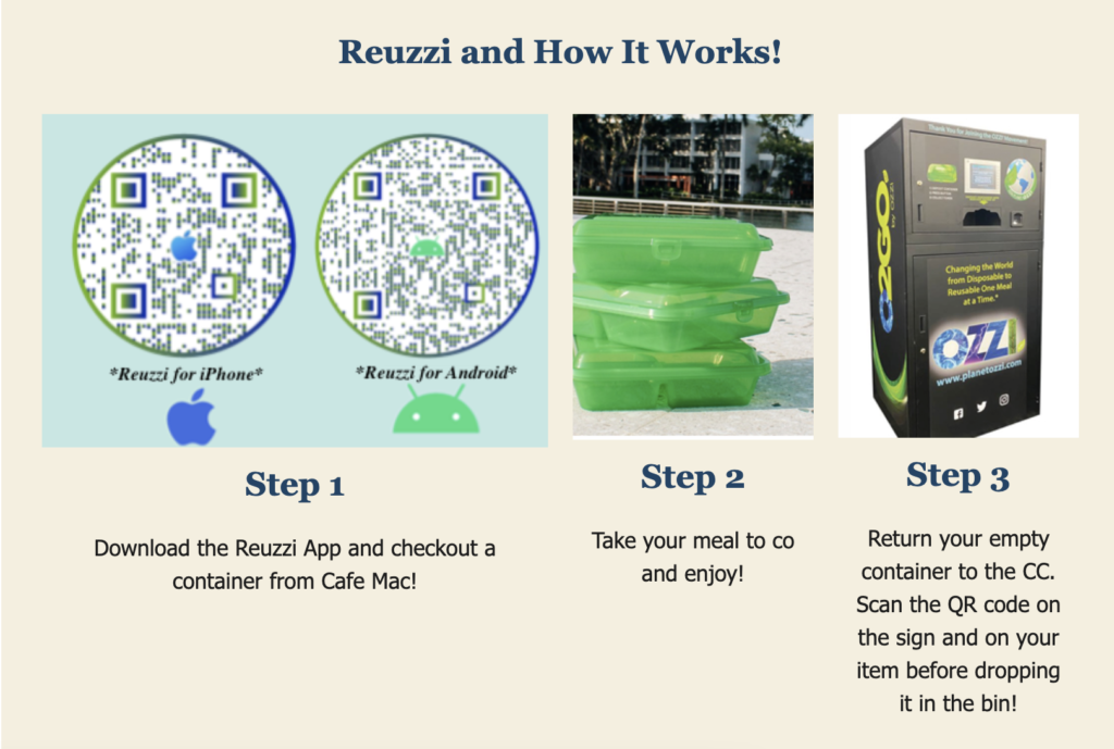 Image Description: Steps showing how to download the reuzzi app and return green take out containers to the campus center.