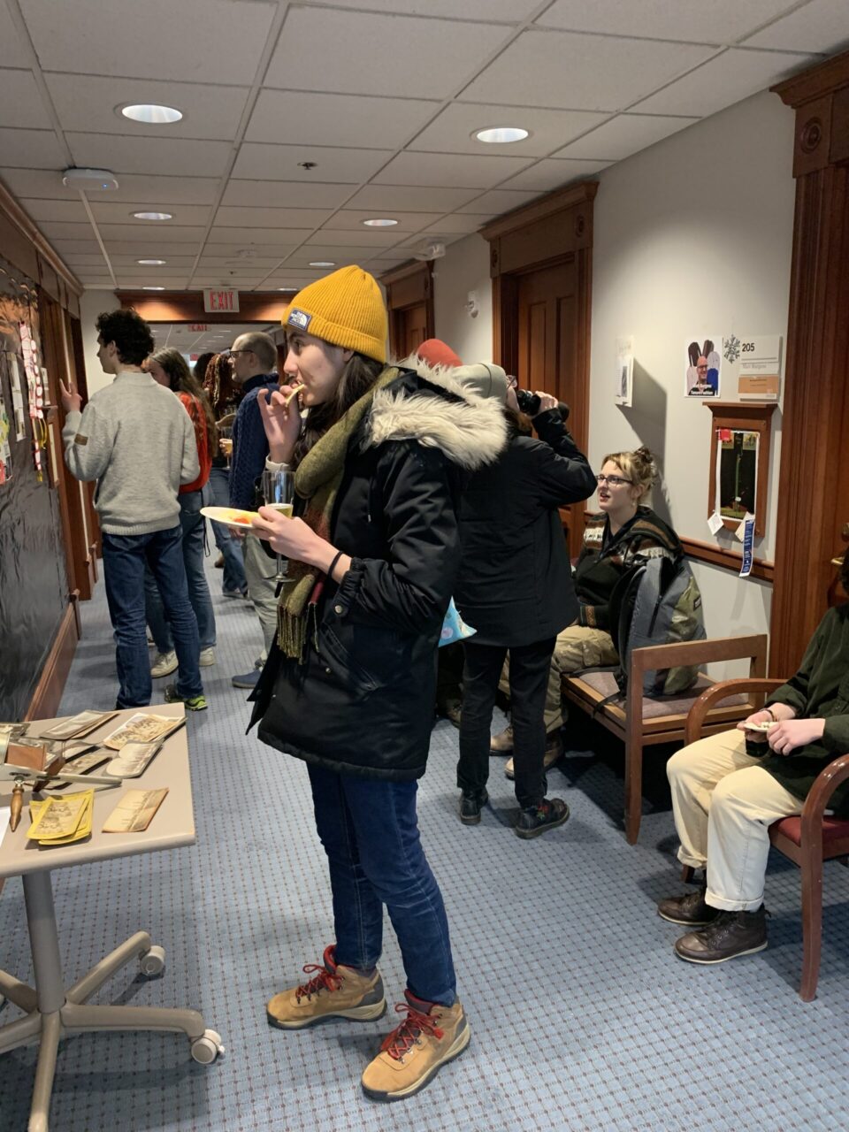 My fellow classmates and I were tasked with creating a museum exhibit on a niche 19th-century British topic. First, we drew slips from a hat with our assigned topic, and then we had the rest of the class period to do as much research as possible on that topic. Some of the topics included “limelight,” a lighting technology using quicklime, “crape,” a deadly mourning fabric, “mummy brown,” a pigment made of ground mummies, “wrought iron,” “jacquard,” “stage coach,” “meerschaum,” “telegraph,” “the power loom,” “Berlin wool work,” and “mudlarking.” Then, hearing of our museum project, the ever-benevolent master-planner, Jan Beebe, set up a lovely gallery opening on Wednesday, March 8th, complete with cheese, crackers, and non-alcoholic beverages in fancy glasses. If you’re interested in seeing these exhibits, they’ll be up for a few more weeks! Just go to Old Main 2, turn right after the stairwell, and you’ll see the exhibits pinned to the wall!