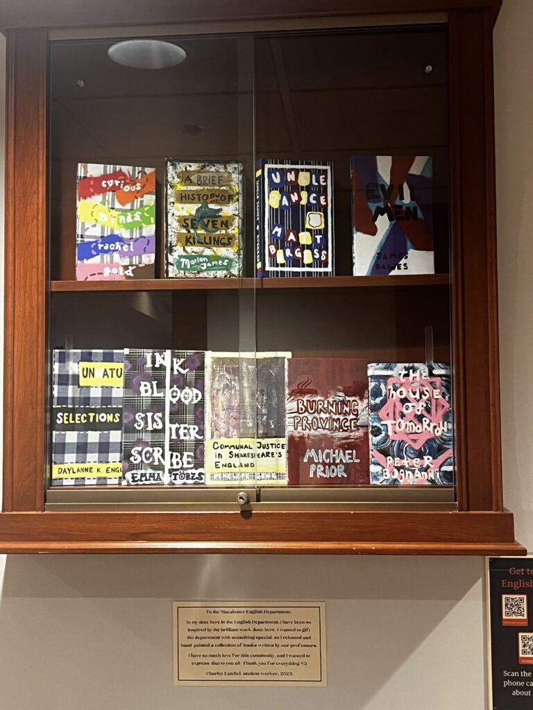 Charley was an English literature major who graduated in the Fall of 2023. As a parting farewell to the department, Charley gifted a project they had been working on for some time: a rebinding of many of the English professors’ books, from Professor Michael Prior’s Burning Province to Professor Penelope Geng’s Communal Justice in Shakespeare’s England. These books are currently on display in the English department just outside Old Main 210 if anyone wants to take a look! Below, Charley answers a few questions about this project, and the craft of bookbinding in general.