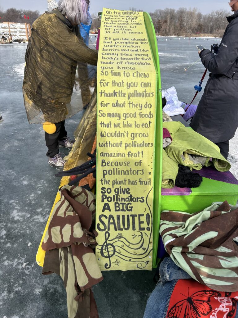 Some shanties get musical. Reduce Reuse Re-Xylophone invites visitors to use mallets to make noise with its wooden and metal structure. Hot Box: Disco Inferno II welcomes guests into a shanty painted to look like a flaming dumpster with a DJ booth and dancefloor inside where they can party for the duration of a couple songs. Pollinator Frenzy dresses its visitors up in butterfly costumes to dance on the ice in a circle around a flat painted wooden flower about ten feet in diameter.
