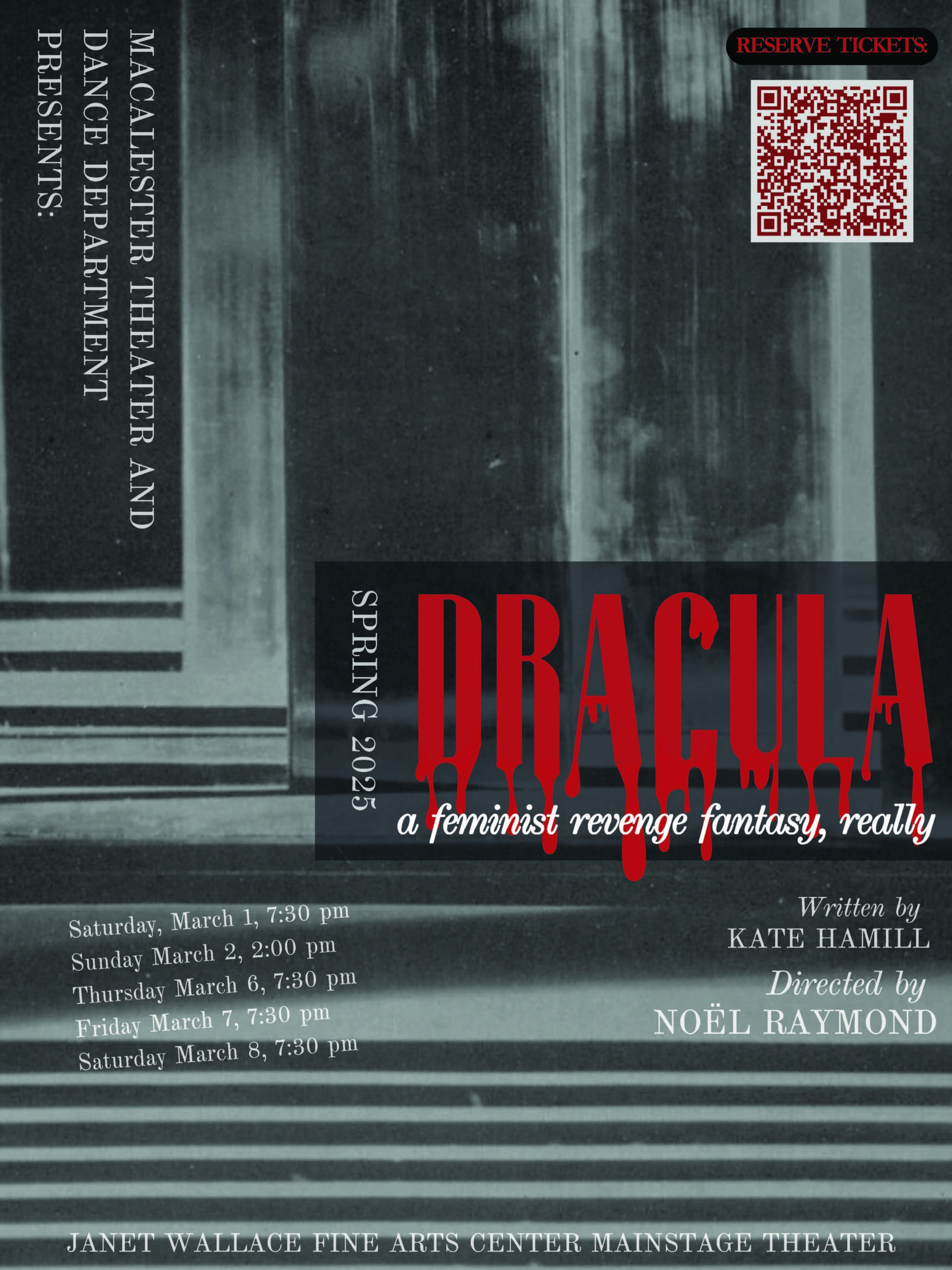 The Words took some time to talk with Lucy McNees ’25 (she/they) and Peyton Williamson ’27 (she/her), both English and Creative Writing majors and both having worked on the “Dracula: A Feminist Revenge Fantasy, Really” production this spring semester. McNees was the dramaturg and Williamson was the stage manager. We were super excited to hear about their experience working on a theatre production that flipped the script on Bram Stoker’s literary classic Dracula.