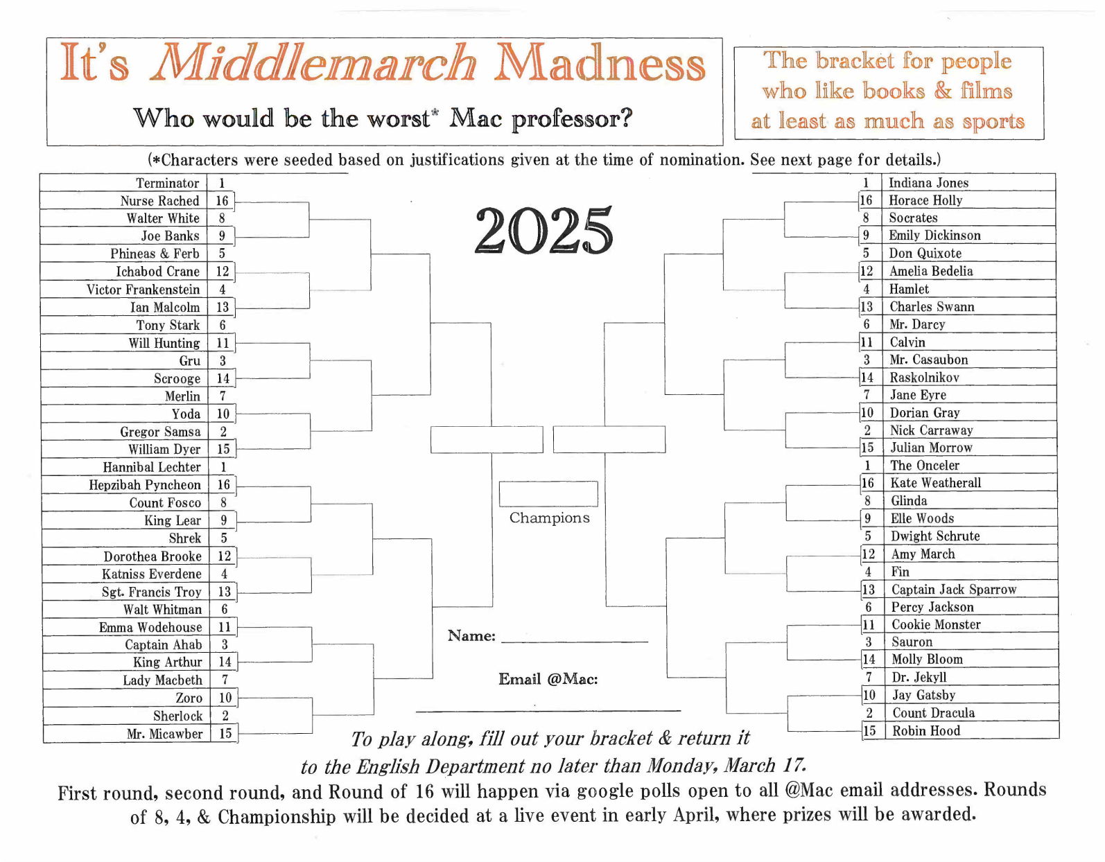 For those of you who did not know, Professor Andrea Kaston Tange not only teaches and studies Victorian literature, but she also organizes the English department’s literary tournament challenge: Middlemarch Madness.