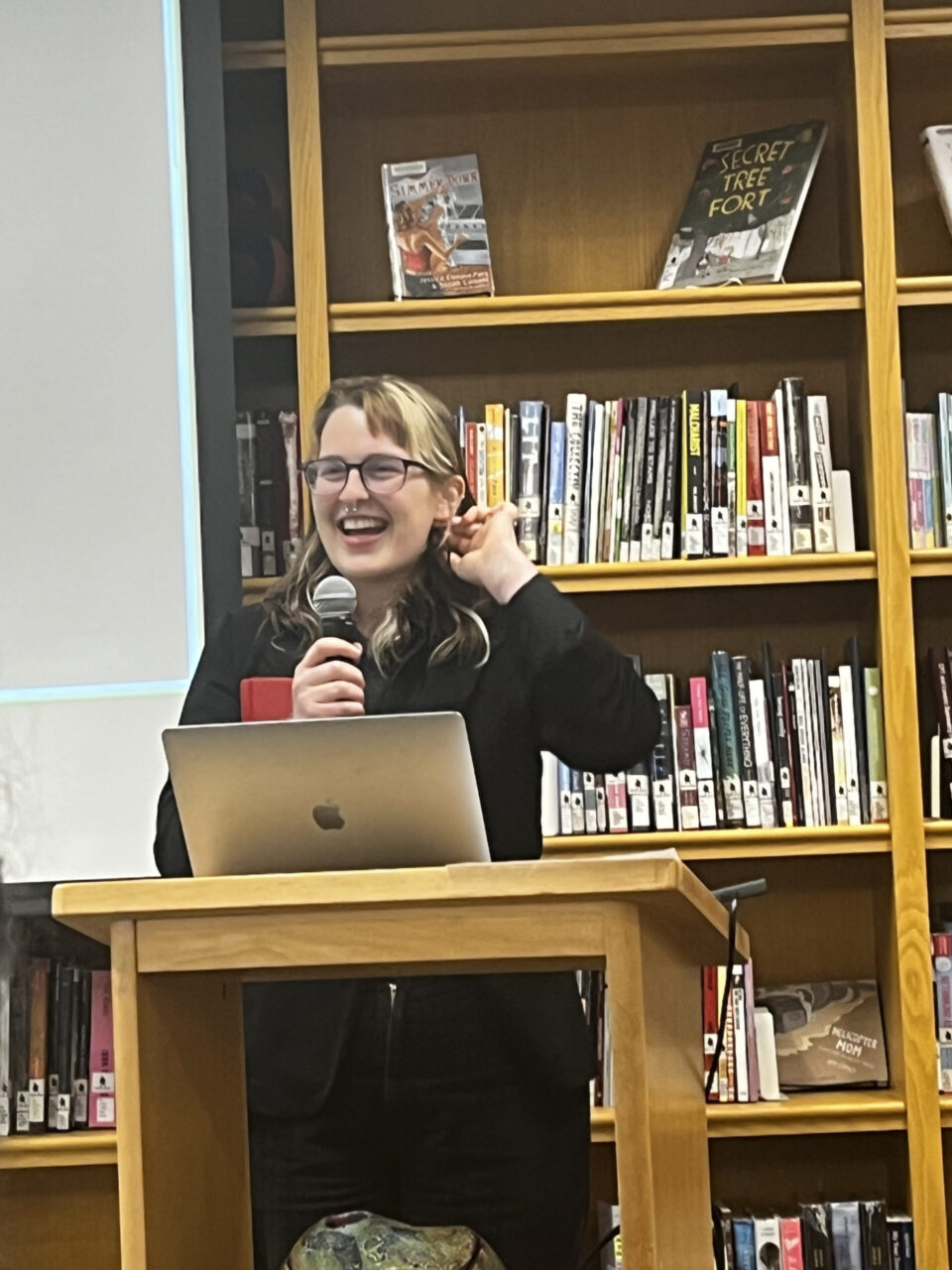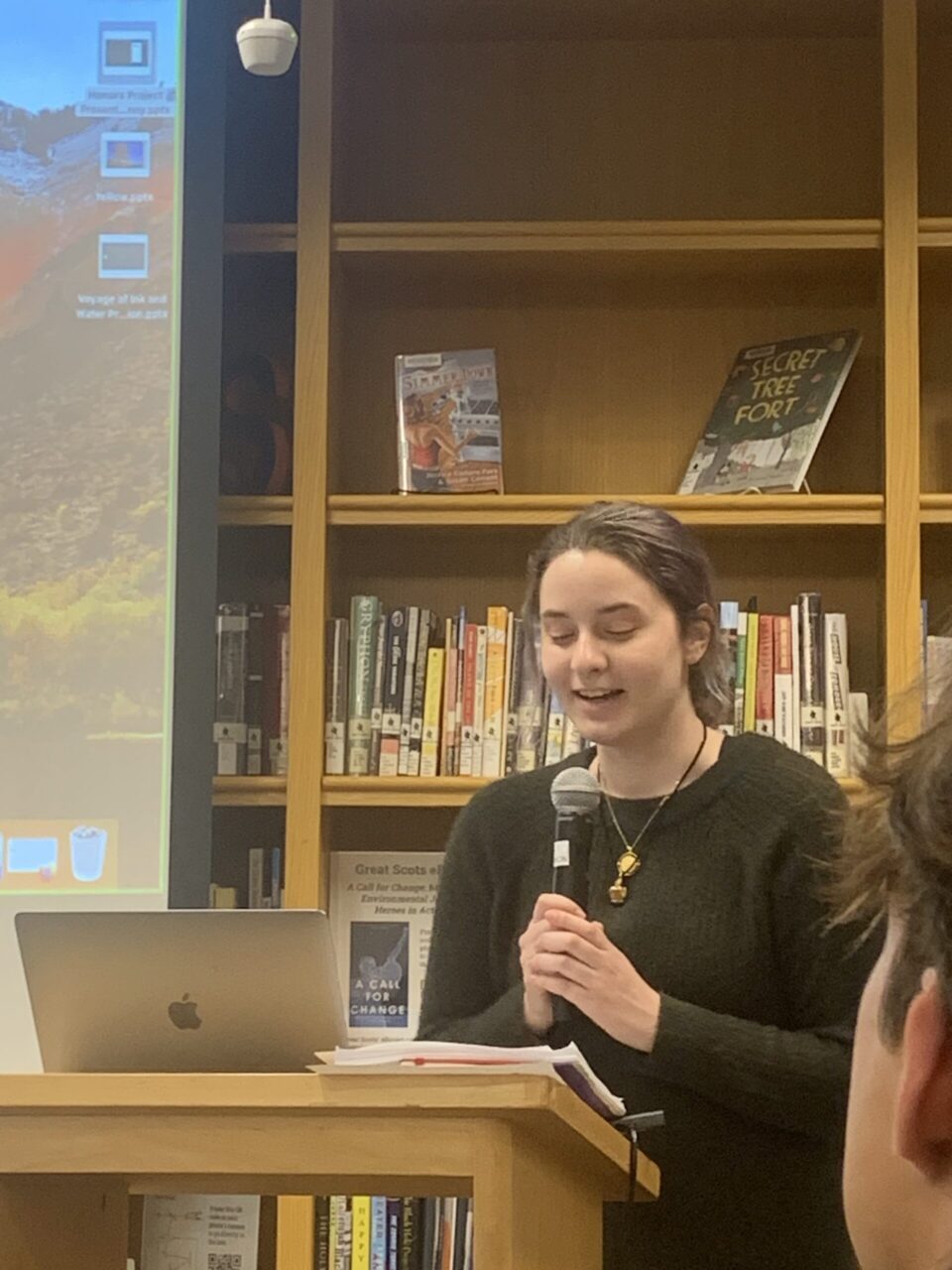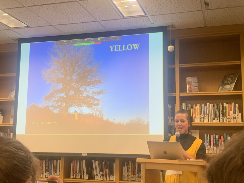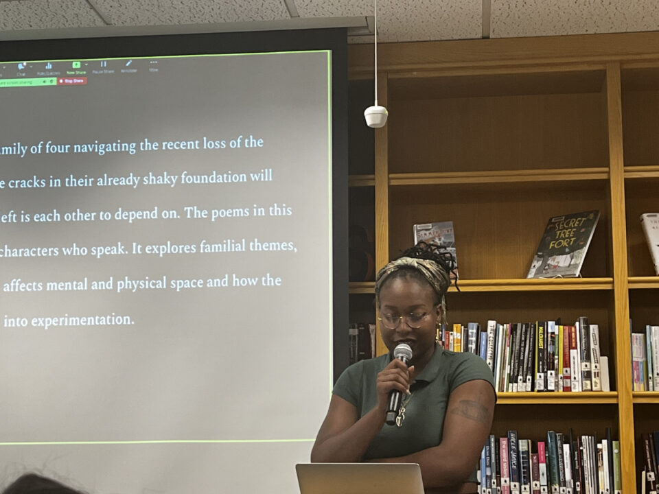 On Friday, April 21st family, friends and professors packed the Harmon room to celebrate the English Seniors who Honors Projects this year. There was record high attendance to support and hear from presenters, Anna Sverclova, Hugh Gabriel, Lenny Prater, Colleen Apostle, and Ella Deutchman – all of whom undertook ambitious, year long creative writing projects with the support of individual faculty advisors. Projects ranged from poems of grief and family, to sci-fi and fantasy novels, and explorations of delight in community. Presenters explained their creative processes and read excerpts from their work with humor, passion and joy. Along with some delicious snacks, it was a great way to celebrate the hard work and achievements of all five students and to learn about all of the exceptional work done by English majors!