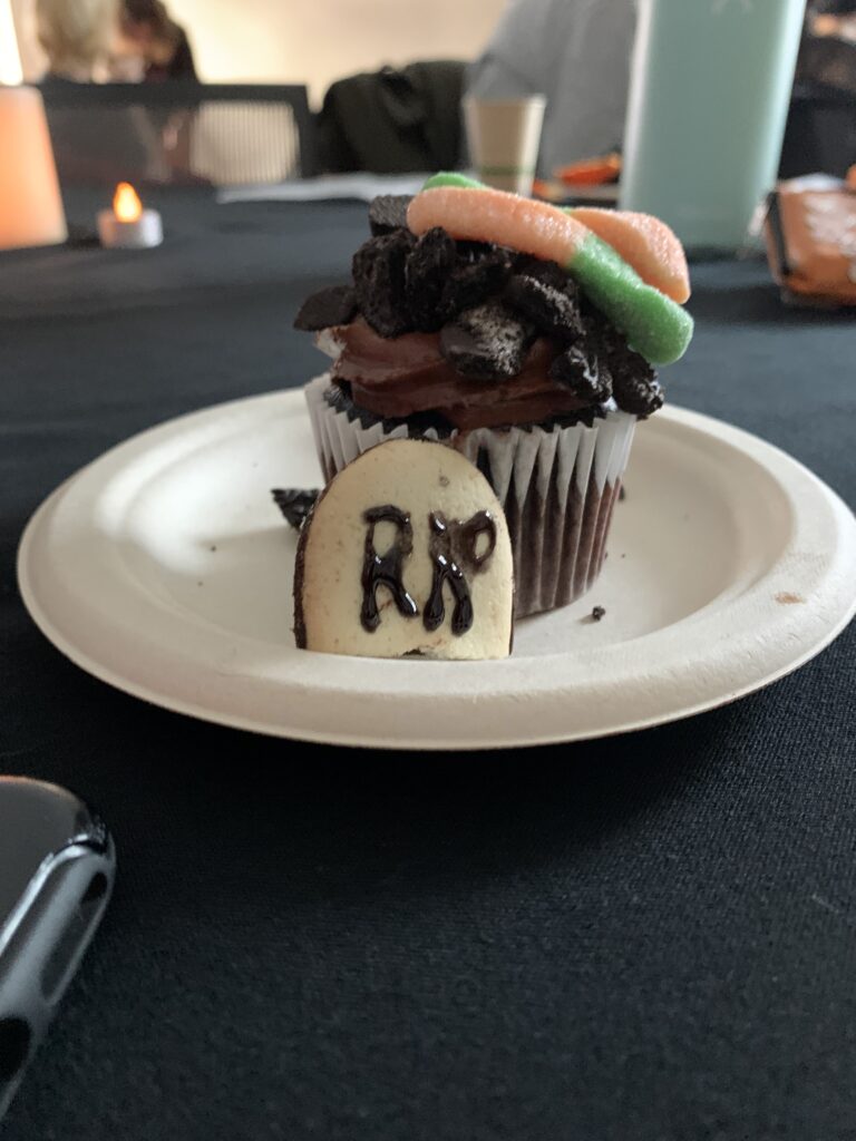 Alongside the English department’s traditional Haunted Coffee House, the new and evolving Literary Salon format offered a fresh opportunity to give students and faculty alike the jeepers-creepers. As the “Panel” name suggests, the literary salon took on a conference-panel like format, plus glowing LED candles, black tablecloths, and graveyard-themed cupcakes. After a quick Haunted Coffee House where students settled in with the aforementioned cupcakes and Jack-o-lantern clementines, the panel got underway!