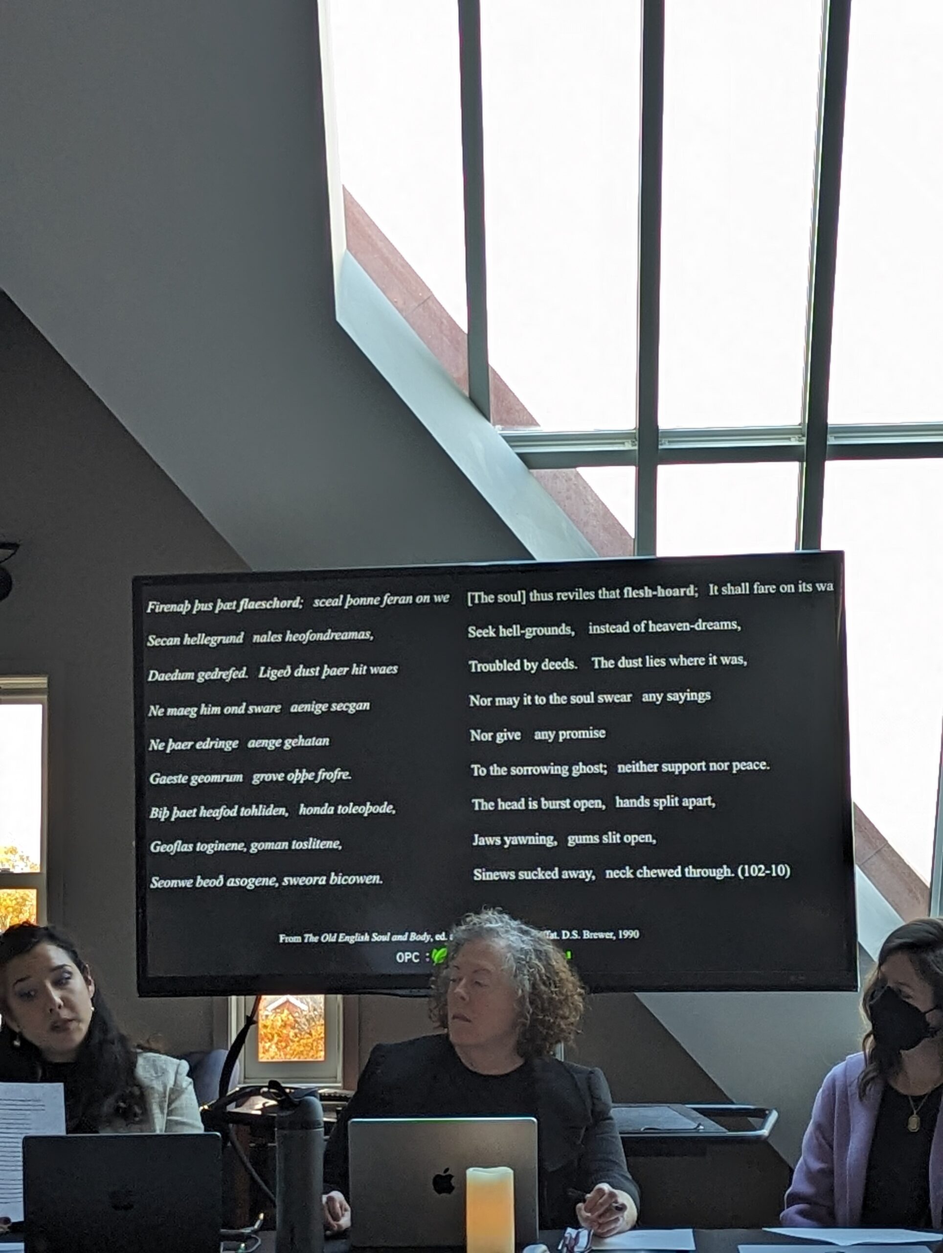 Professors Daylanne English, Coral Lumbley, and Amy Elkins explored the theme of death from three different avenues. Dr. Lumbley kicked off the panel by invoking the thin line between life and death during autumn, when the leaves are at their most vibrant before dying. She then used this reminder that death is a part of life to transition into a paper on death in medieval Europe, explaining beautiful, illuminated manuscripts with eerie parables, showing opulent Catholic relics and funeral effigies, and even reading some macabre poems aloud in old English!