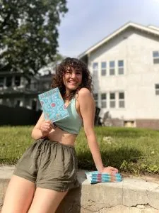 Miriam Moore-Keish posing with a copy of Clearance Philosophy