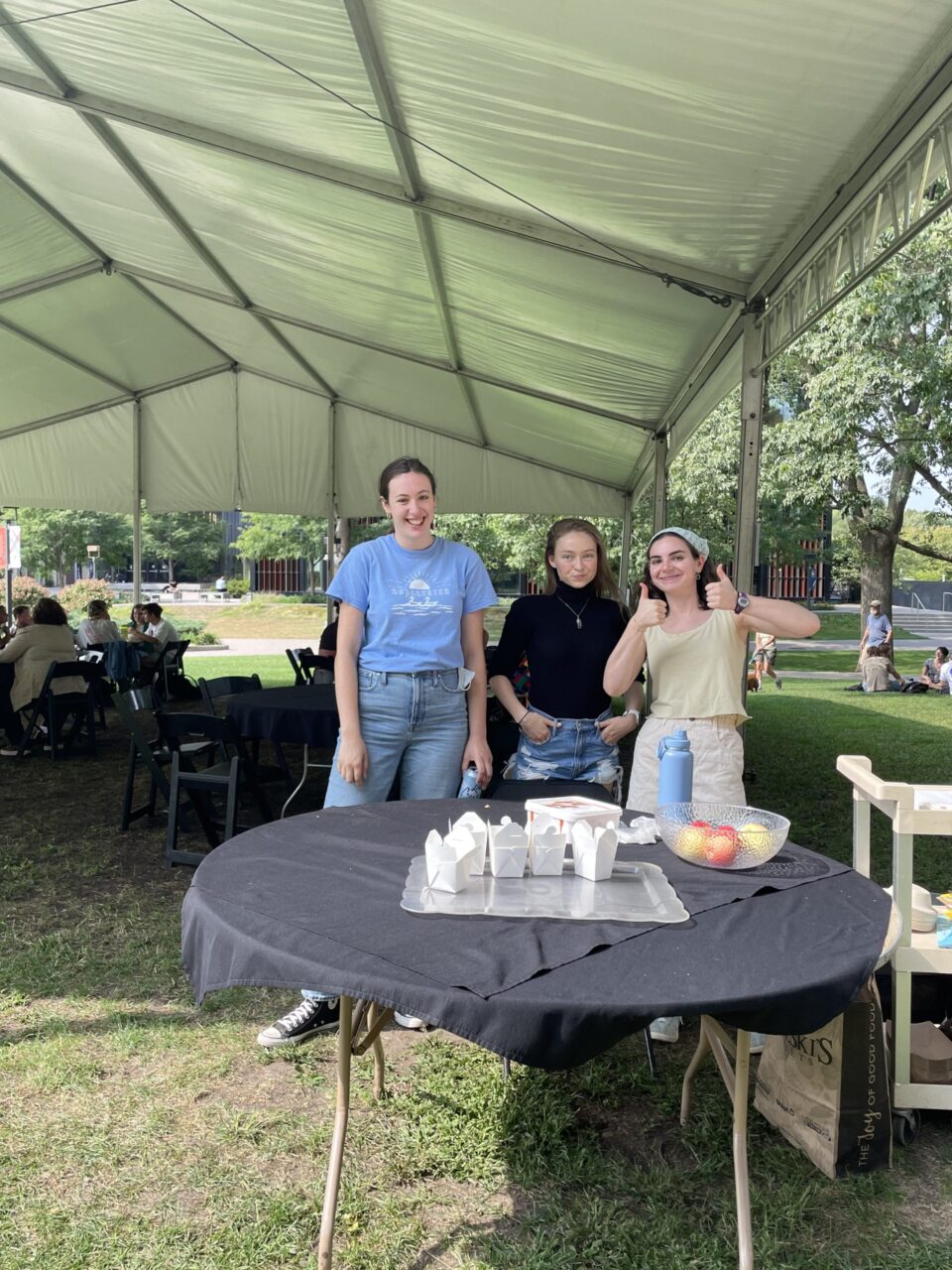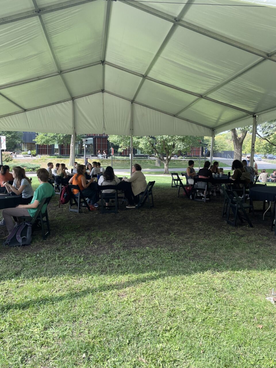 On Thursday, September 15th, students and faculty of the English Department gathered on the Leonard Center Portico for our annual Fall Luncheon. Delicious food was provided by Sambusa Express, and our student workers came together to staff the event. English majors, minors, faculty, staff, and friends of the department gathered on the grass and under the tents for food and conversation.