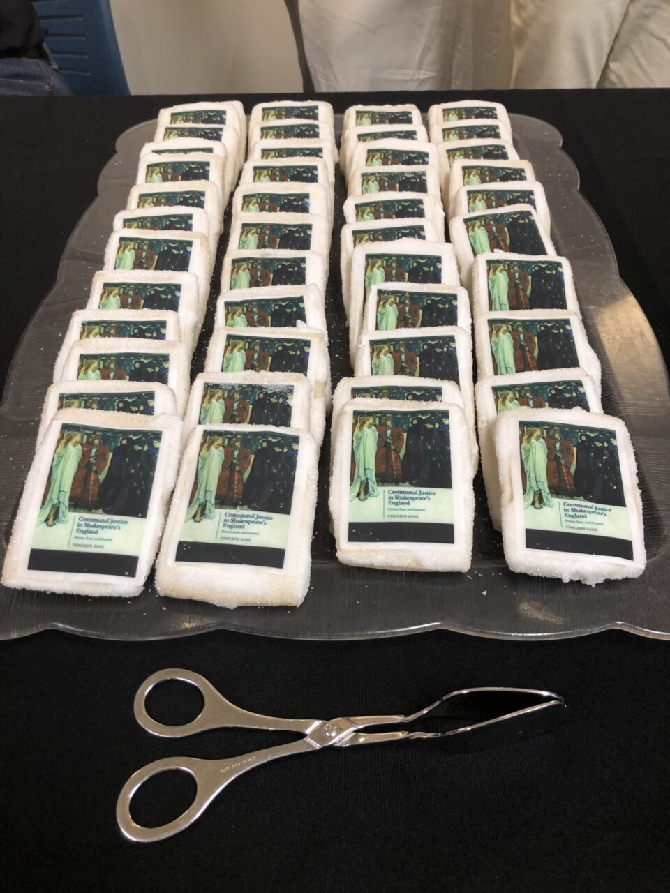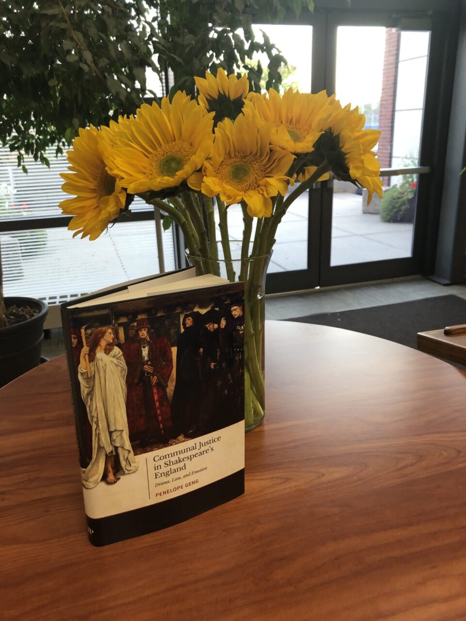 On October 8, the English department community came together for the first in-person faculty book launch in over a year. The book being celebrated, Professor Penelope Geng’s Communal Justice in Shakespeare’s England: Drama, Law, Emotion, was published in April 2021, but the official launch was postponed until this fall, so that attendees could physically gather for the occasion. As such, many in the audience had been eagerly anticipating the event for some time, and between the excitement of hearing about Professor Geng’s important work, the joy of seeing familiar faces again, and the wonders of the ever-popular book cover cookies, their hopes were not disappointed.