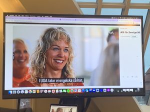 The English Department has a reality TV star! On February 9th, during the department’s weekly Coffee House event, English majors, aficionados, and student workers gathered for a showing of the Swedish reality TV series Allt för Sverige (Great Swedish Adventure), starring none other than professor Sally Franson. Originally a Norwegian show about immersing Americans in Norwegian culture, the Swedish version takes that original idea and frames it in a new way: using the family histories of Swedish-Americans to teach them about Sweden’s past and present. The show’s contestants are all Americans with Swedish ancestry. Throughout the series, they explore family history that they often know very little about. The contestants also participate in games and competitions, and the grand prize is a reunion with their living Swedish relatives. Read more about Professor Franson’s TV career here…