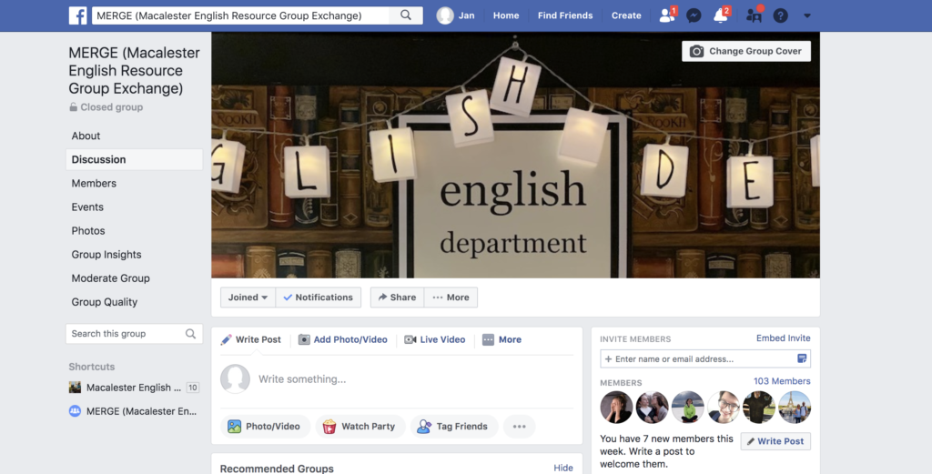 Maybe you want to become a bit more involved. On Facebook, we recently launched the catchily monikered closed group MERGE or Macalester English Resource Group Exchange. You know it’s legitimate because it has a convoluted name in the service of a clean acronym. But there’s more to MERGE than its title. We’re hoping to cultivate a self-sustaining independent ecosystem where all English majors past, present, and future, as well as faculty and staff, can share tantalizing job offerings, community events, writing contests and more! Give our tireless department coordinator Jan a much-needed break from forwarding emails about that cool summer internship at Graywolf Press.