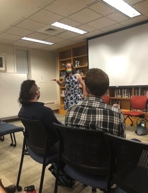 After this, Rachel Gold joined Dr. Burt to present on the new webcomic they are writing together: Boys Against the Current. This is a retelling of the classic American novel The Great Gatsby, which just entered the public domain this year. In this webcomic, the Gatsby characters are written as queer and genderqueer, taking the subtext of the original book and making it a full part of the story. While using the basic plot framework from Gatsby, Boys Against the Current presents an entirely new, unique world and story. Boys takes place not in the roaring 1920s, but in the 2020s, so it deals with concerns of the present day and near-future. For example, most transport in the comic is done by boats rather than cars, as roads have sunk below sea level due to climate change. A detail I liked was that the famous “eyes of T.J. Eckleburg” billboard from the original story has now been re-imagined as a huge solar-powered laser in the sky.