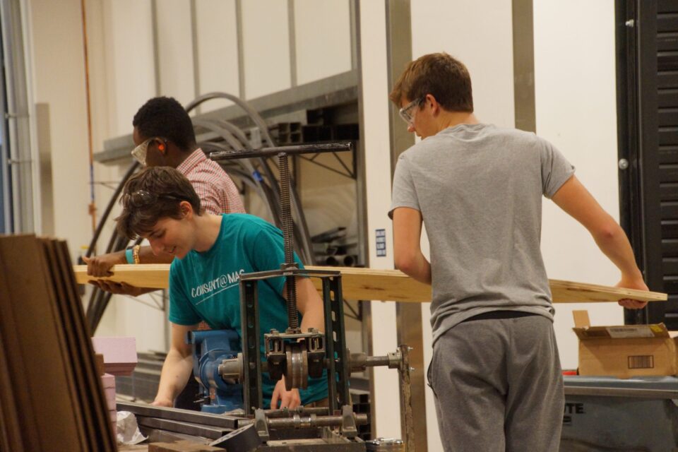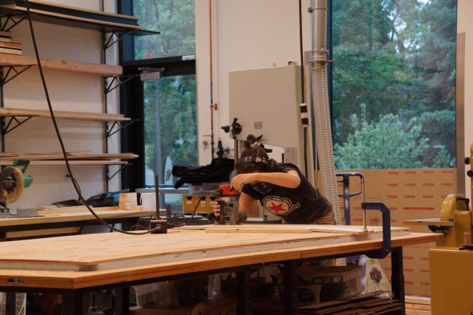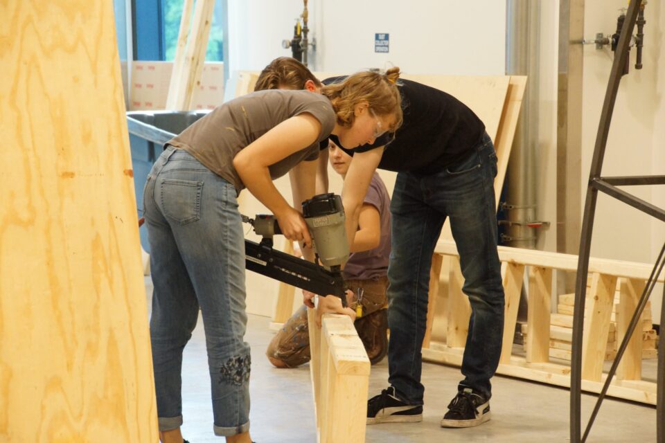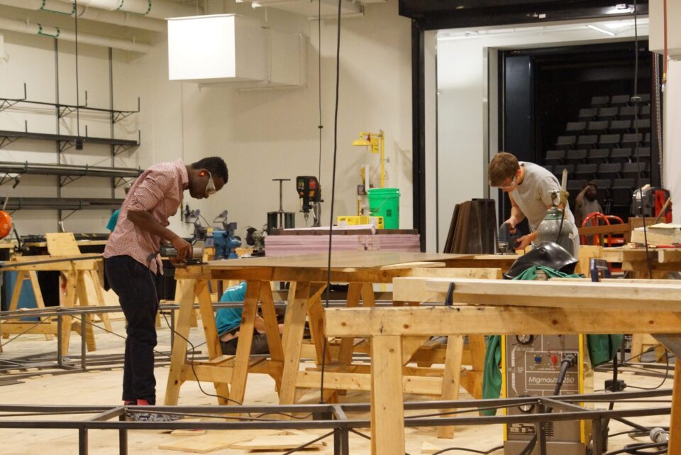 Student staff in the scene shop work to support the Theater and Dance production season. That work involves carpentry, welding, painting, rigging and installation of lighting, projection and sound systems, as well as a variety of other tasks. Good communication and collaboration skills are essential; if you are looking for a place to work with your hands and enjoy working with others, the scene shop may be a place for you. For more information, contact Technical Director Tom Barrett: [email protected].
