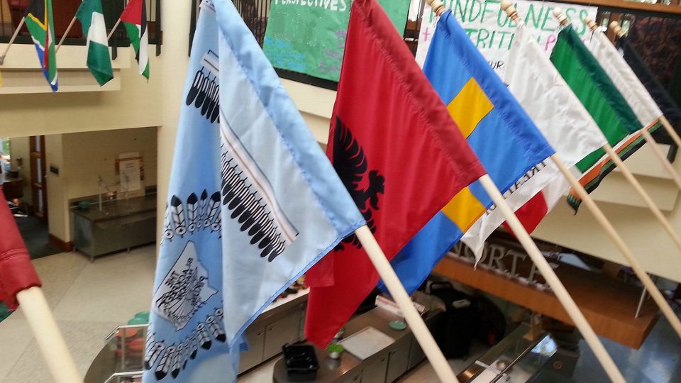 Flag from the Blackfeet Nation (Montana): Flags flown around Cafe Mac include Native American nations in which current students are enrolled members.