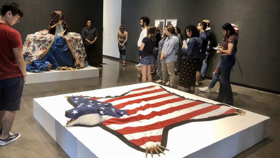 Professor Kiri Sailiata’s Radical Reelism: Indigeneity, Politics and Visual Culture class viewing artist Nicholas Galanin’s collection in the Law Warschaw Gallery on campus Fall 2019.