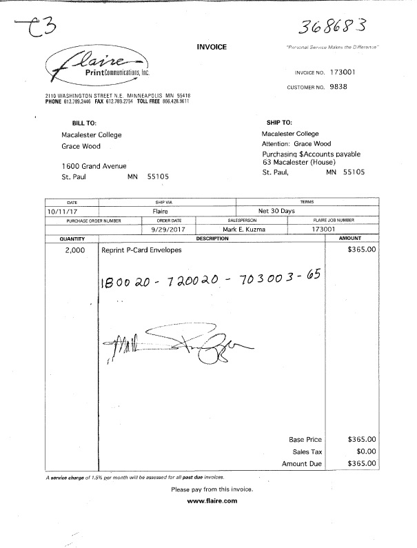3. Send the original invoice to the 77 Mac, Accounts Payable. See the sample of what an invoice ready to be submitted via Campus Mail.