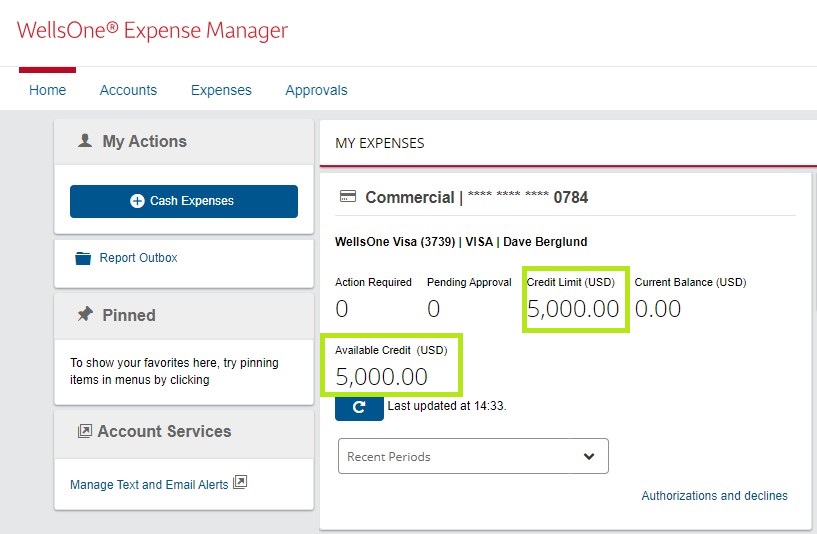 Most cards have a monthly limit of $5,000 and single transaction limit of $2,000.  To review your card limits and see available credit, login to Wells Fargo. Click on Payments & Transfers, and then click WellsOne Expense Manager.