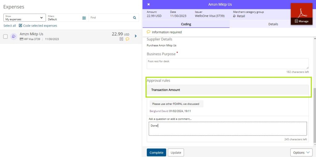 The expense will show back up on your main Expenses page. Click on it to open it, and scroll to the bottom. Expand the Approval Rules section by clicking on the header to view your Approver’s note. Fix the issue, and then add a reply to your approver to let them know the request is completed. Press the Complete button on the expense to re-submit it to your Approver.