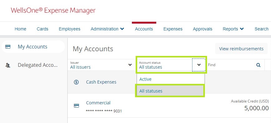 If you need to look at past statements for a card that is now closed (including cards closed due to fraud), you will need to click on the Account Status filter, and then click All Statuses.