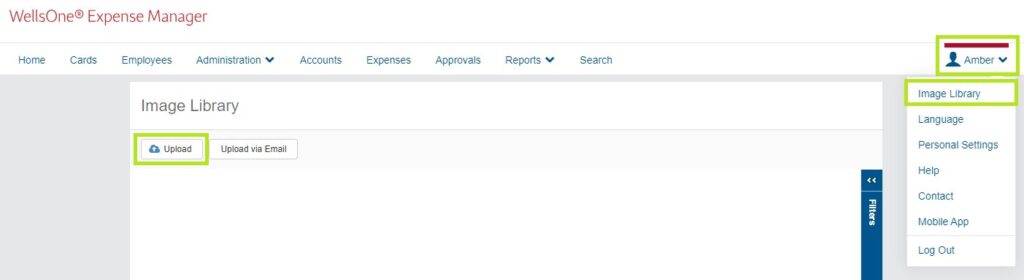• You can upload files to your Image Library from your desktop computer files. Login to your WellsOne Expense Manager. Once logged in, click your name in the upper right corner to pull up your personal menu. Click Image Library, then click Upload. Choose the files you want to upload, and then click Open.
