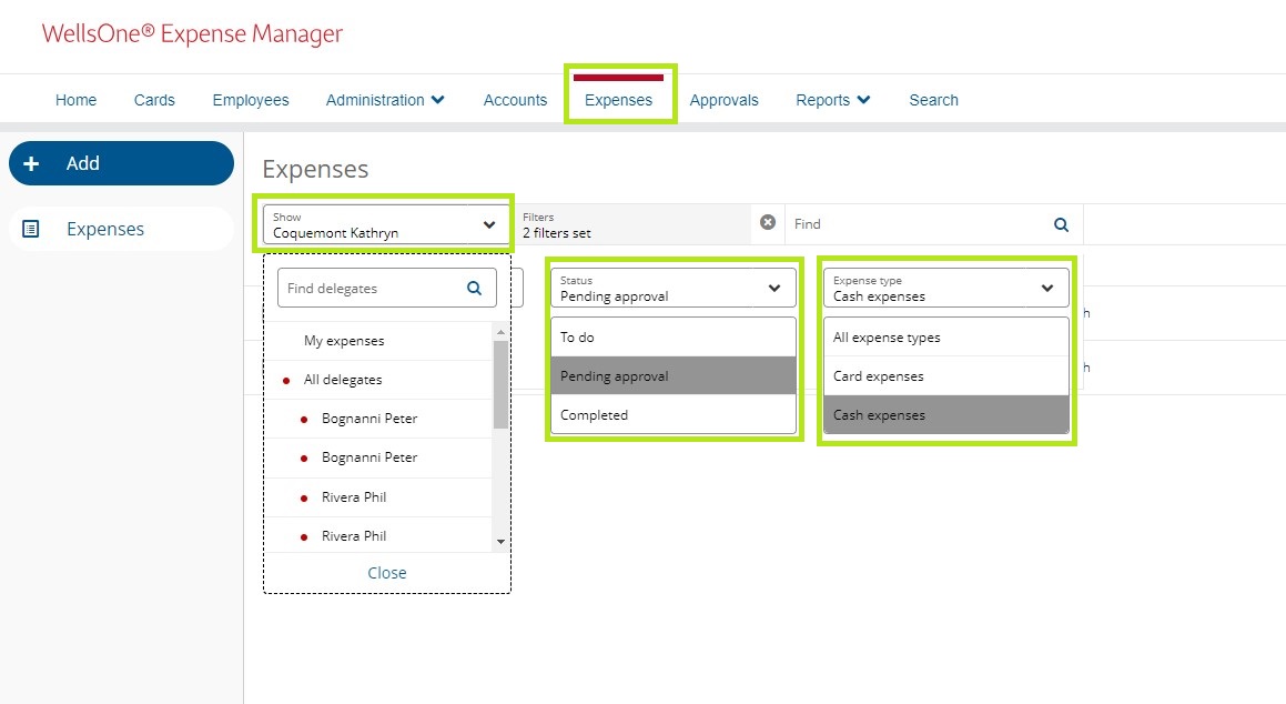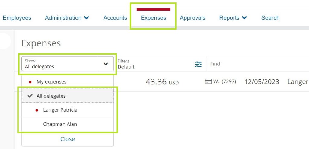 To find your Completed expenses, navigate to the Expenses page. If you’re a Delegate for someone else and need to view/reset their expenses, click on Show My Expenses and choose the account you want to view.