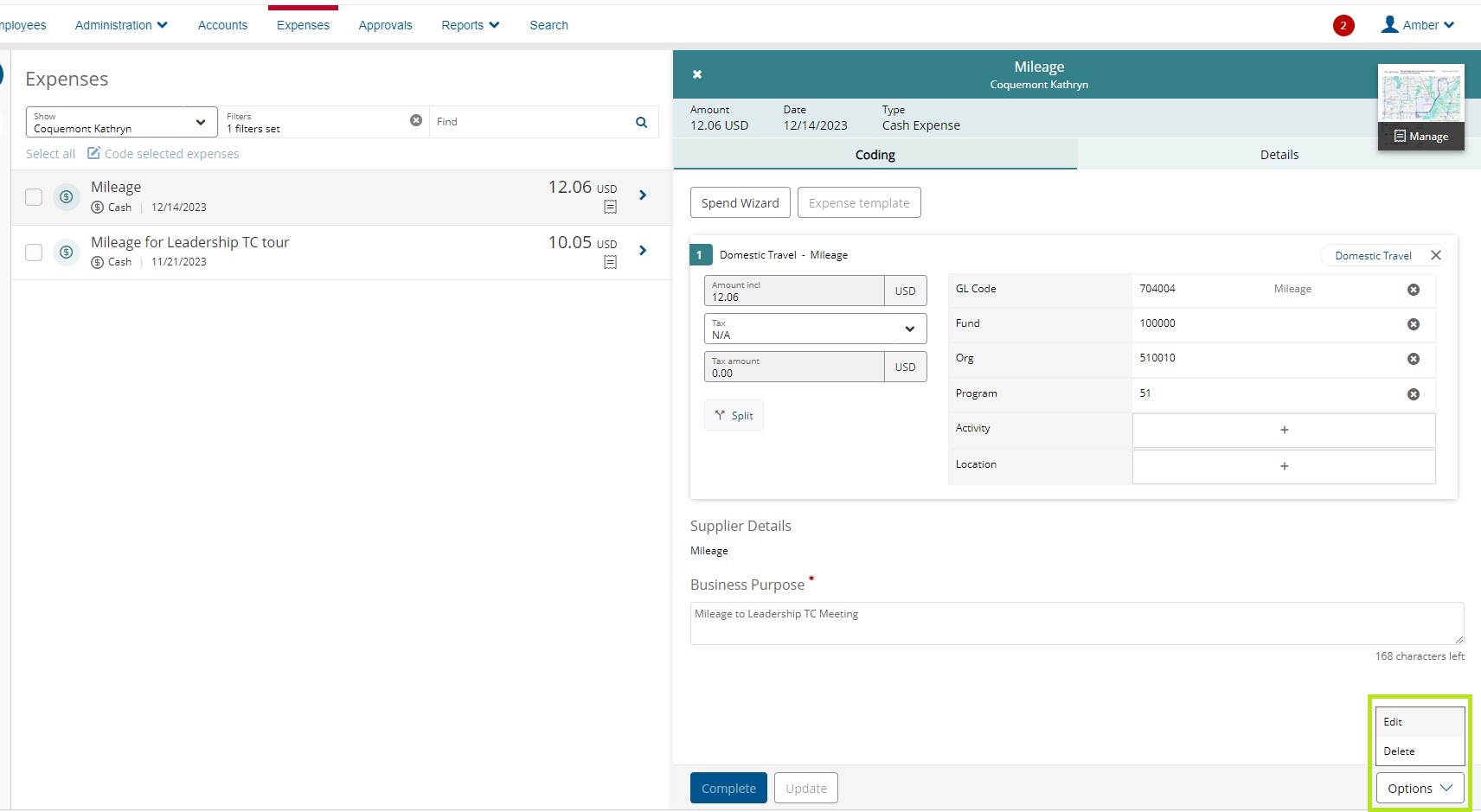 Once you’ve found the expense, click on it. The expense will open, and on the bottom right corner click the Options menu. Click on Edit if you want to keep and edit the expense, or click Delete to fully delete the expense.