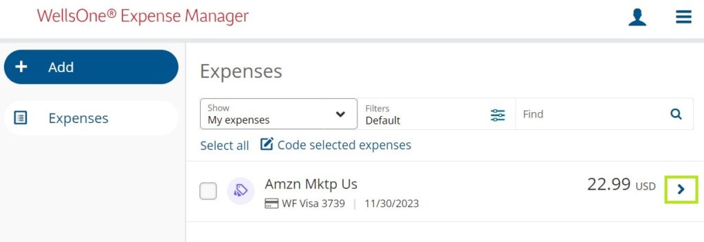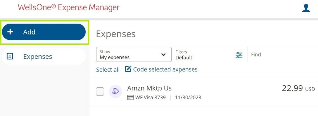 To Add OOP Expenses, navigate to the Expenses page in your Wells Fargo Pcard account. Once there, click on the big blue Add button. If you are Delegate for another cardholder and need to add an OOP Expense for them, you must first click the Show My Expenses filter, and then select the person’s account before clicking the Add button.