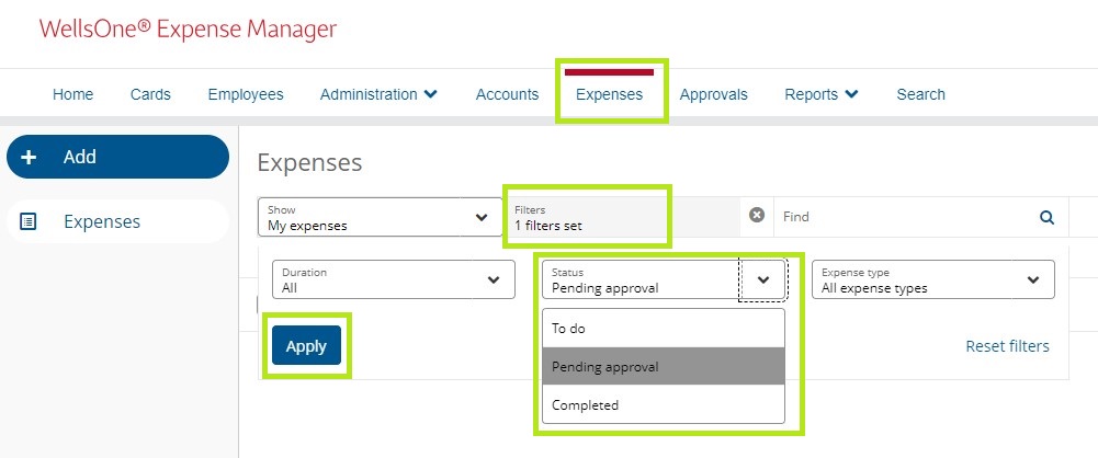 Next, click on the Filters field. Click Pending Approval to see expenses you’ve submitted to your approver that haven’t been approved yet, then click Apply. If the expense(s) you’re looking for isn’t in the Pending Approval list, then click the filter again and select Completed to see expenses you’ve submitted to your approver that have been approved. Click Apply.