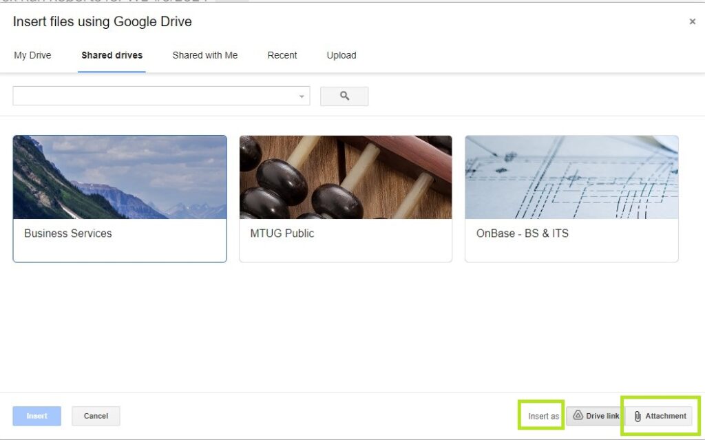 • If you store your files in Google Drive, you can attach Google Drive files to the email to send, but you must choose to insert the files as ATTACHMENTS, not Drive Links.
