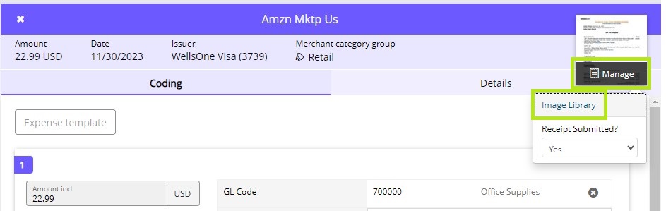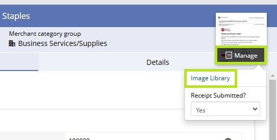 Once you find the expense, click on it to open it. If you are uploading a receipt for the first time, proceed with doing so as you normally would. If you already uploaded a receipt and realized it is incorrect, click Manage on the receipt icon in the upper right corner, then click Image Library.