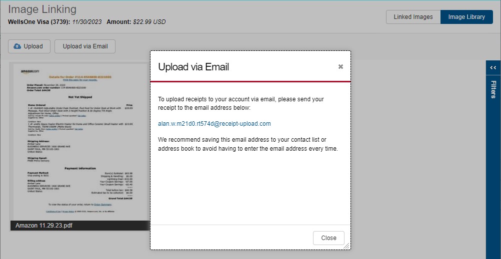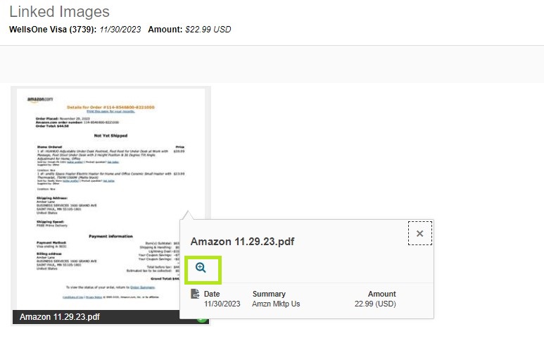 If a receipt was auto-linked, you’ll get the following screen showing what was linked. Click the image, and then click the magnifying glass to see a larger version so you can verify the correct receipt was linked.