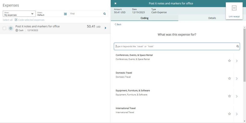 You must go through this Spend Wizard process for OOP Expenses on the Coding tab. Do not click the Details tab. The Spend Wizard cannot be skipped like with regular Pcard Expenses. Select the appropriate expense category (scroll down to see all choices). If you click a category and can’t find the type of expense you’re looking for, click Back, and try another category.