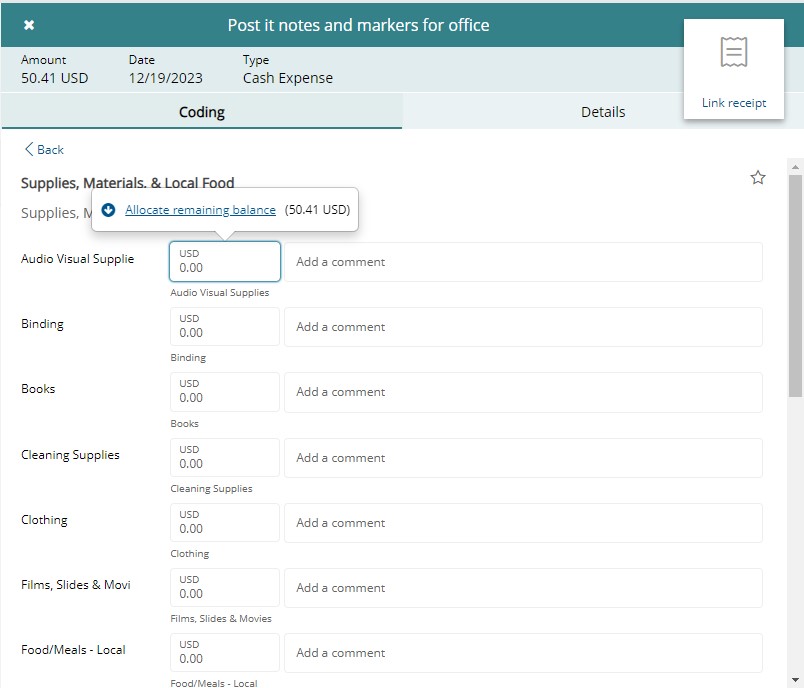 You will see multiple expense types to choose from. Please note that each OOP expense needs to be entered SEPARATELY. You should only use multiple fields here (I.E, books, clothing, cleaning supplies) if they were part of the same receipt. You can click Allocate Remaining Balance on whichever item is applicable to easily populate the amount, or you can type in the dollar amount. Leave the comment field blank. When finished, scroll down and click Next.