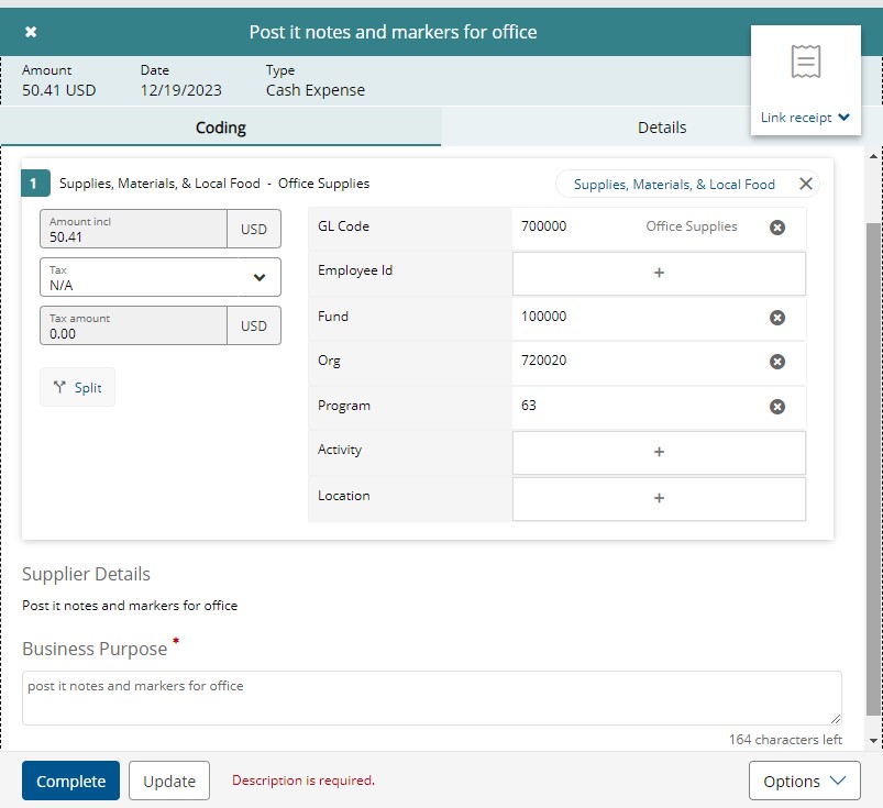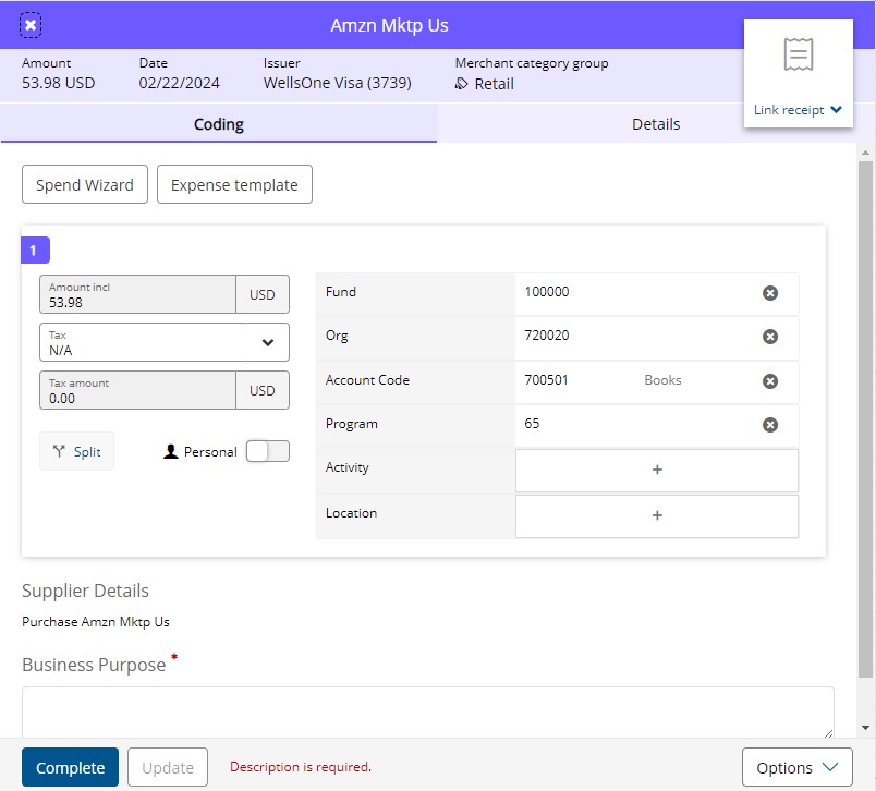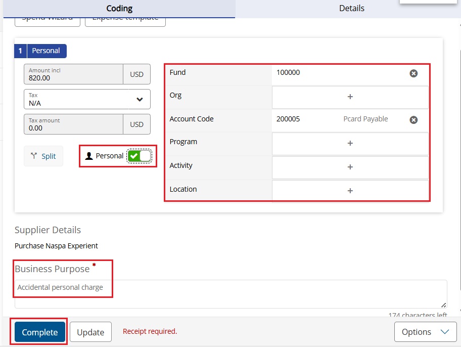 The base default FOAPAL will be automatically populated, but you can adjust it if needed following the same process as you would normal Pcard expenses. This is also where you can now add your purchase description in the Business Purpose field. You can hit Update to save your progress. You must hit Complete to fully submit the expense to your approver.
