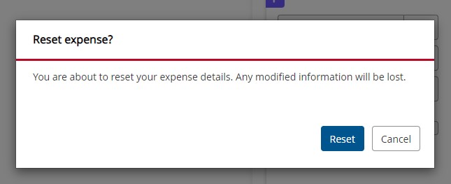 The following prompt will pop up; click Reset. As mentioned, the description and any changes to your default FOAPAL will be lost. It will retain the linked receipt, though.