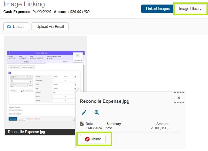 Once the Image Library opens, click the linked receipt, and then click Unlink. Once it is unlinked, you can proceed with uploading and linking the correct receipt as you normally would.