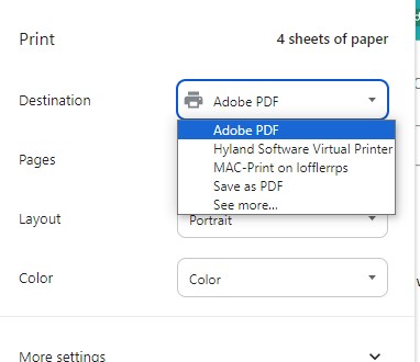 • Once the print screen opens, select Save as PDF or Adobe PDF as your destination printer, and then click Print.