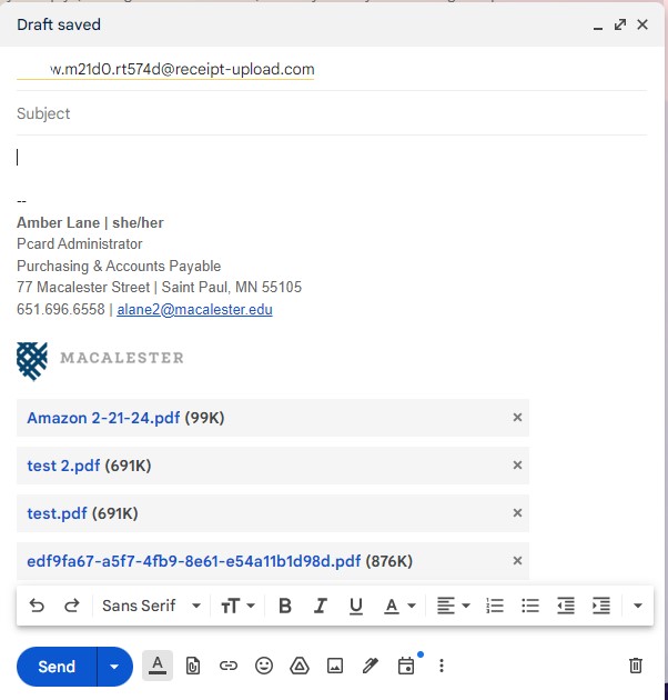 • Compose a new email to your unique email address (not the one in the screenshot below, that is just an example). Attach your receipt files, and click send. You do not need to include an email subject or body text.
