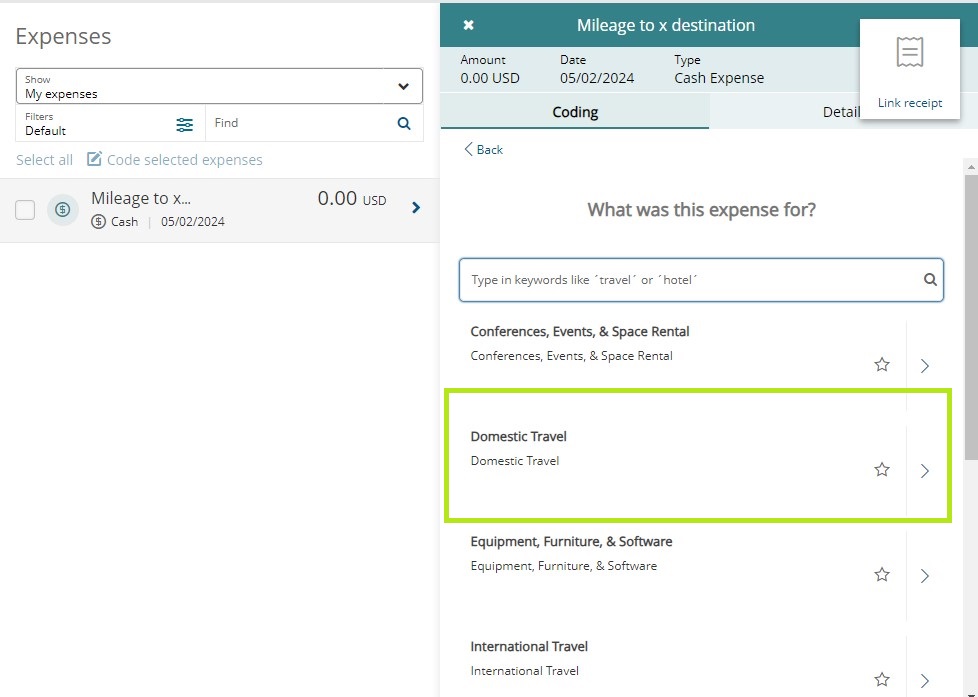 You must go through this Spend Wizard process for OOP Expenses on the Coding tab. Do not click the Details tab. The Spend Wizard cannot be skipped like with regular Pcard Expenses. For mileage, select Domestic Travel.