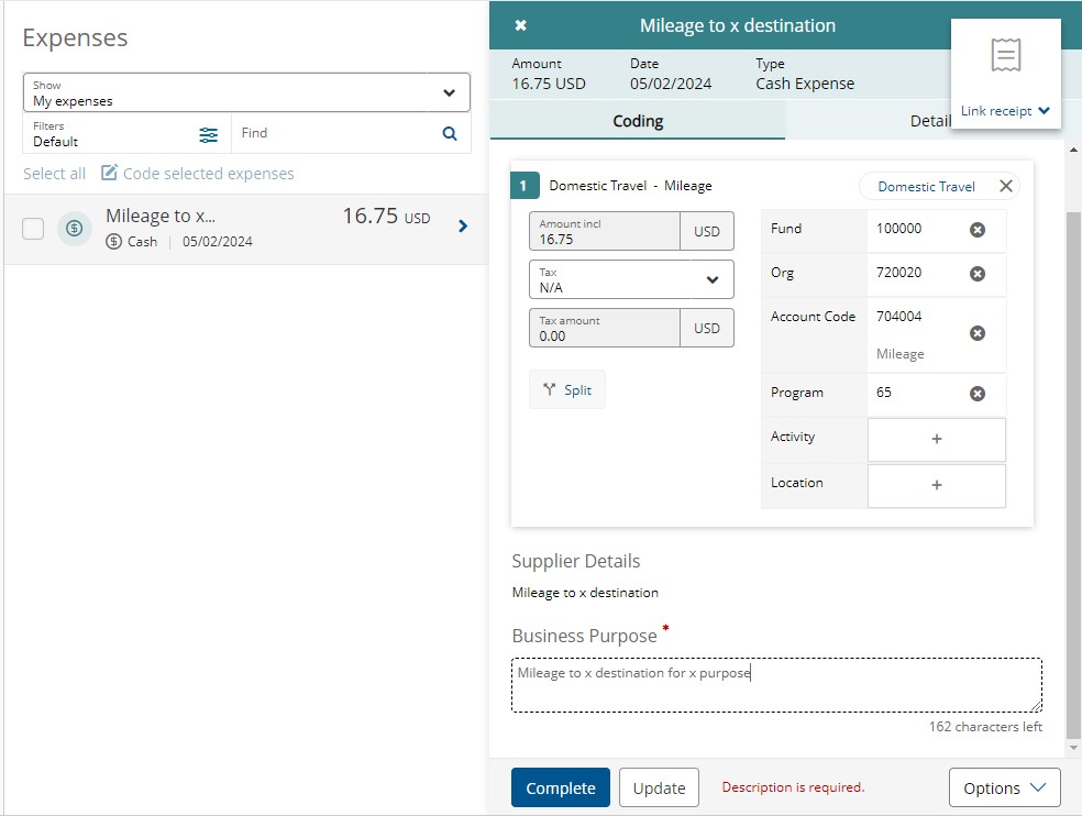 The base default FOAPAL will be automatically populated, but you can adjust it if needed following the same process as you would normal Pcard expenses. This is also where you can now add your purchase description in the Business Purpose field. Your ‘receipt’ can be a map or driving directions for the distance calculated. Click Update to save your progress. Only click Complete when you are done editing; this will fully submit the expense to your approver.