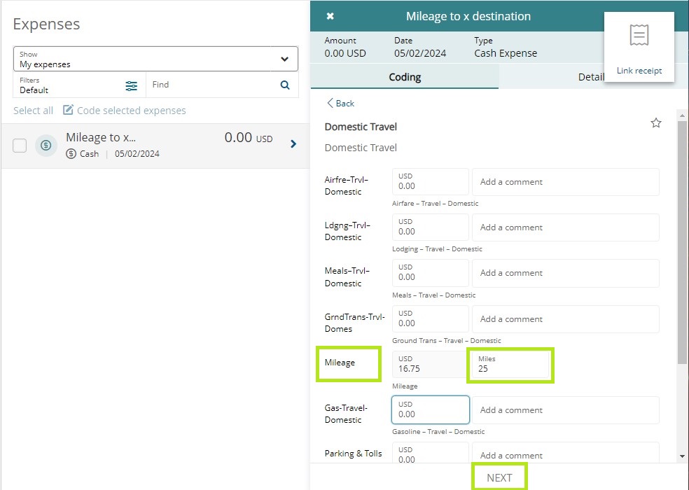 Enter the number of miles driven in the right side Miles field. The dollar amount will automatically populate based on the current IRS mileage rate. Leave the comment field blank. When finished, scroll down and click Next.