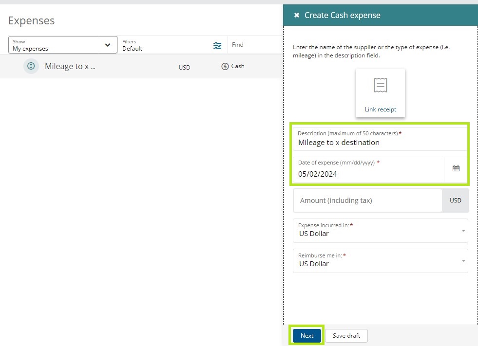 The Create Cash Expense pane will open. Select the date of the trip and add a trip description. Do not enter a dollar amount on this first screen for mileage reimbursements. Once finished, click Next.