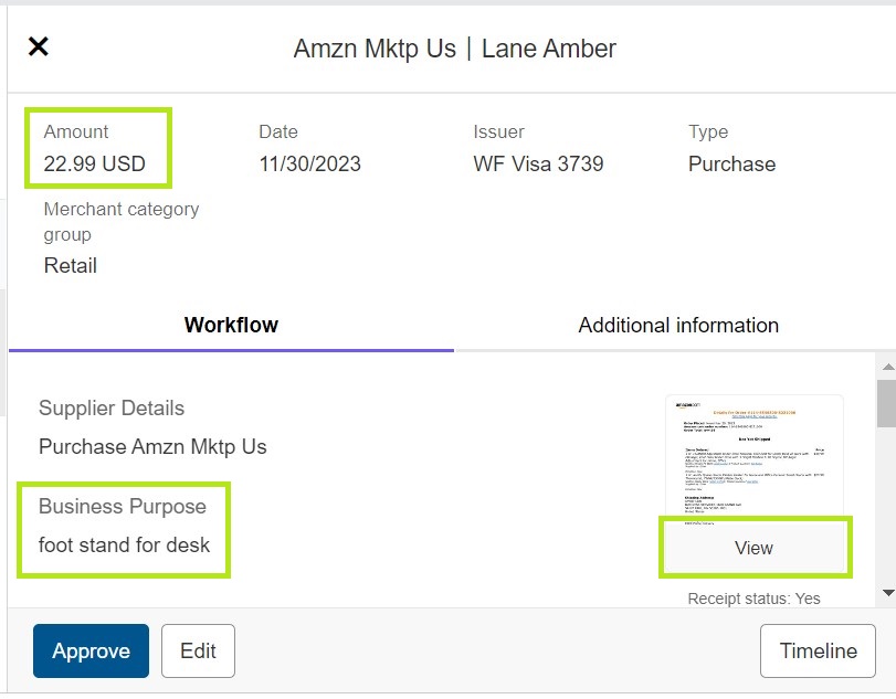 Once the expense opens, you can see the basic transaction details on top. The cardholder should have reviewed the FOAPAL and corrected it if necessary, entered a valid Description (Business Purpose) of the expense, and uploaded the receipt. Review the description, and then click View on the Receipt to see an enlarged version to verify the correct receipt was attached and that the expense was work related.