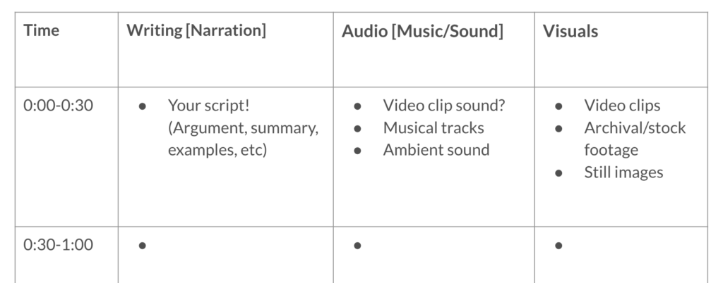You don’t necessarily have to draw out every frame of your essay (though it can be helpful). But placing your script (or outline) alongside visual and auditory elements will help you think through transitions, gather the appropriate materials, and strengthen the rhetoric of your images and sound.