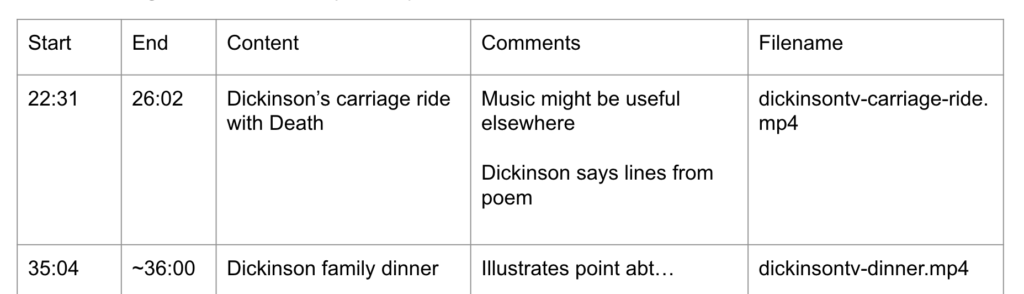 Clip logging often consists of two parts. The first part consists of watching films and writing down (logging) timestamps for the parts that you’ll need. Here’s an example log from a project about screen representations of Emily Dickinson: