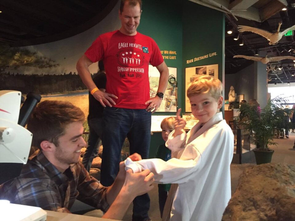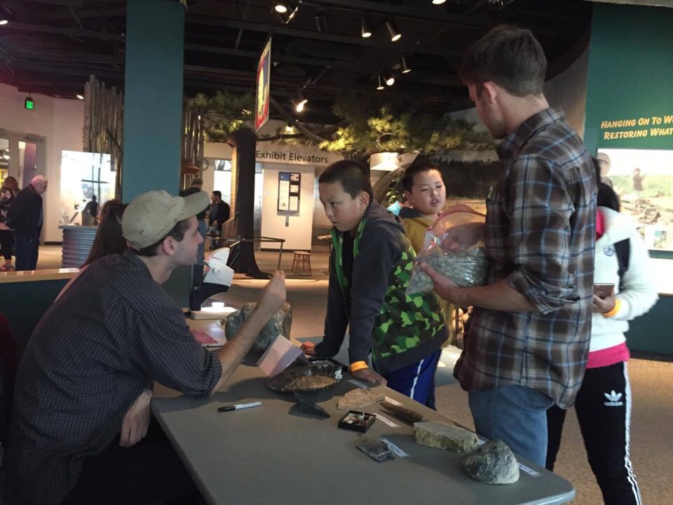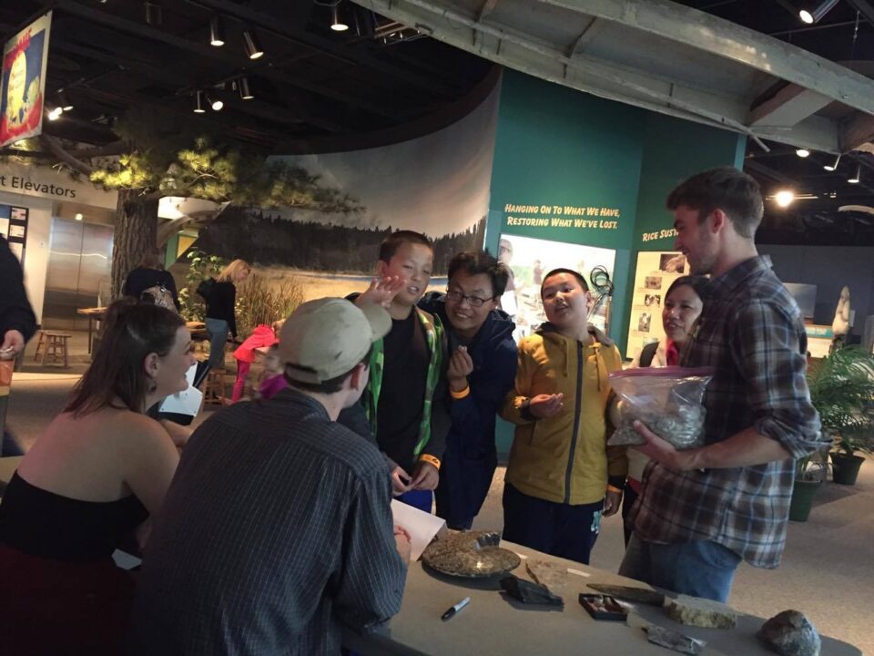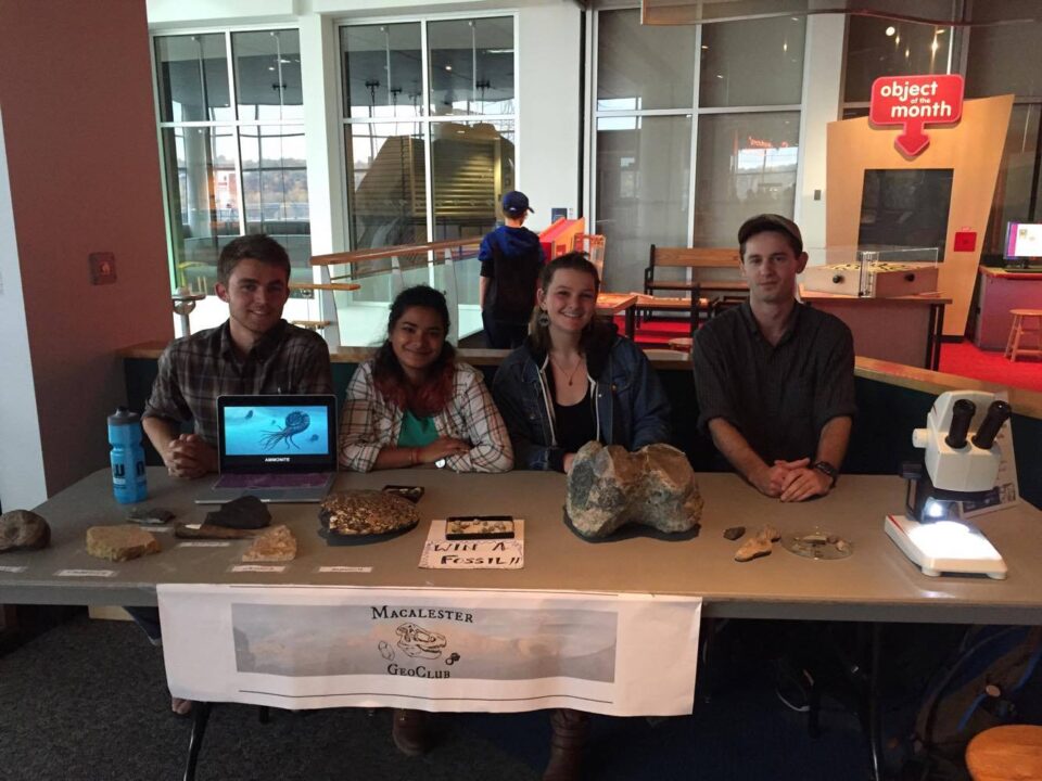 To celebrate National Fossil Day, Macalester GeoClub went to the Science Museum of Minnesota to talk to the local community about some of our favorite fossils! Pictured are geology majors Rachel Surprenant ’18, Nolan Ebner ’18, Mac Doherty ’19, and Ojashvi Rautela ’19. They presented dinosaur bones from the Judith River Formation in Montana as well as some assorted invertebrate fossils from around the world, including stromatolites and several types of cephalopod.