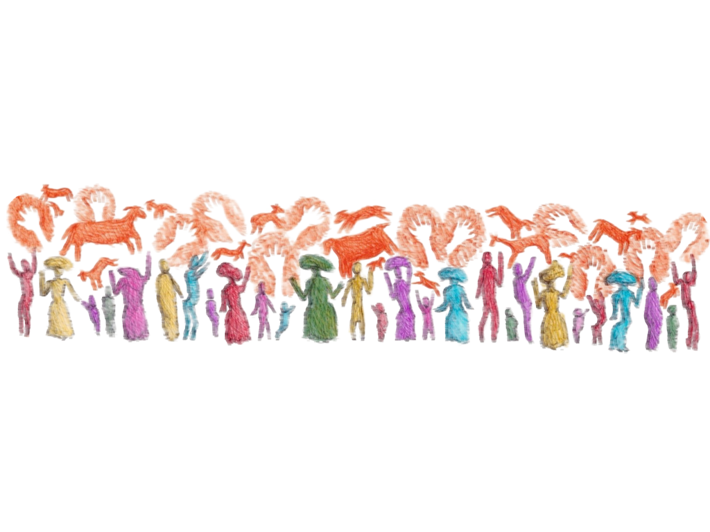 This pen and ink drawing depicts a community of people composed of various identities creating, admiring, and explaining cave paintings to one another. It is meant to celebrate the storytelling threads that tie our species together and remind us of the beauty they can produce and have produced.