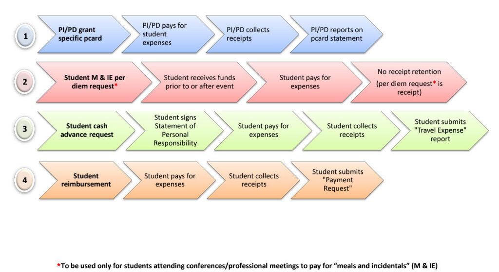 The purpose of this reference is to define payment options for student travel expenses to attend conferences and professional meetings paid with grant funds. A combination of options may be used.