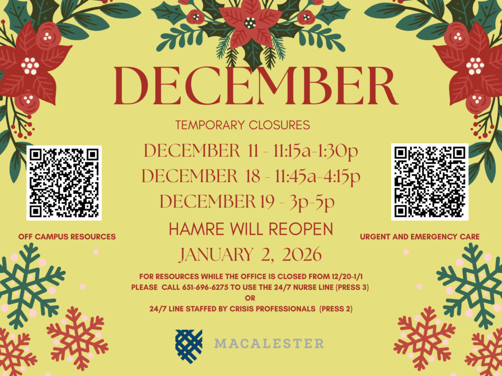 The Laurie Hamre Center for Health & Well-being offers integrated medical and counseling services as well as campus leadership on health promotion and sexual respect for all students and serves as a resource supporting the entire Macalester community’s effort to build a healthy campus. We are dedicated to providing care, support, and connection to resources for students of all identities.