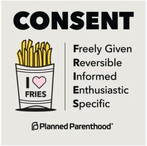 Defining Consent It can be difficult to navigate new relationships, whether they are platonic, romantic, or sexual. No matter the kind of relationship, it is best to practice the values of everyday consent. Consent is like FRIES: