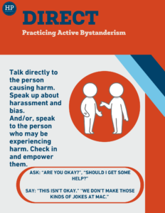 Request an Active Bystander Workshop We all have the choice and ability to be part of a positive culture for consent and sexual respect at Macalester. Becoming and active and engaged bystander is one of the most effective means of preventing sexual violence. Active Bystanderism involves developing the awareness skills and courage needed to act in a situation when another individual needs help. Being an active bystander allows individuals to send powerful messages about what is acceptable and expected behavior in a community.